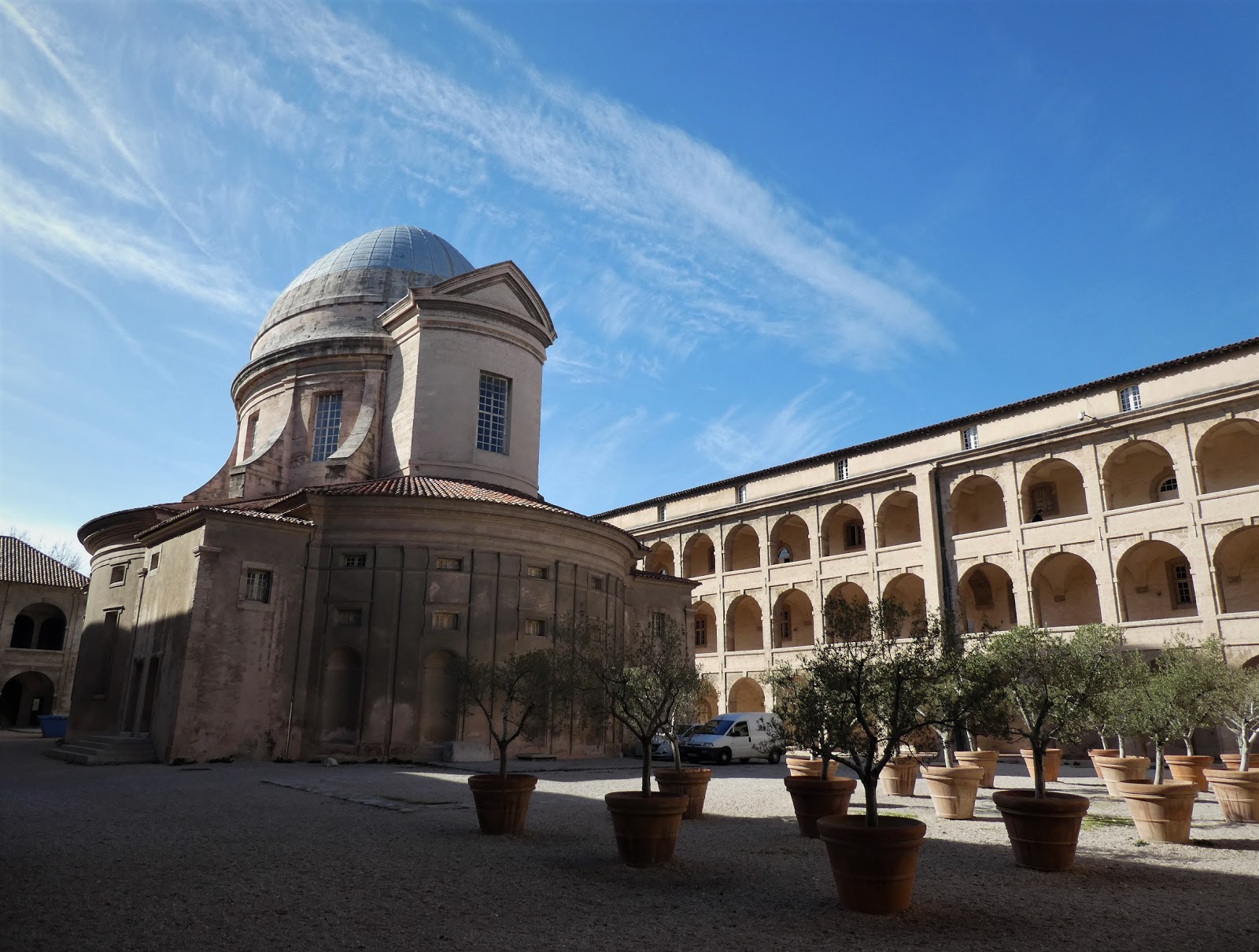 La Vieille Charité (The Old Charity) in Marseille France is considered a masterpiece of 17th century architectural design. The name of charité is misleading. Beggars & homeless people were imprisoned here & forced to work, an uncharitable attitude common at the time. La Vieille Charité is located in the heart of Le Panier, the old city of Marseille. The grand architecture & open space is quite striking among the narrow streets & modest houses of Le Panier. La Vieille Charité was built between 1671 & 1749, following the plan of architect Pierre Puget. The larger building is a 3-story rectangle surrounding a courtyard. A chapel with a portico supported by Corinthian columns is at the center of the courtyard. The portico is similar to those of Roman temples. Both buildings are constructed of pink & yellow sandstone from ancient quarries at Cap Couronne. Although it was not damaged during the French Revolution or WW2, it became quite degraded during more than two centuries of various uses. La Vieille Charité was restored between 1970 & 1986. It now houses the Museum of Mediterranean Archaeology & the Museum of Art of Africa, Oceania & Amerindia. Both are only moderately interesting. There is also a research library of archaeological documents, a school of advanced studies in social sciences & offices of the Centre National de la Recherche Scientifique (French National Center for Scientific Research).